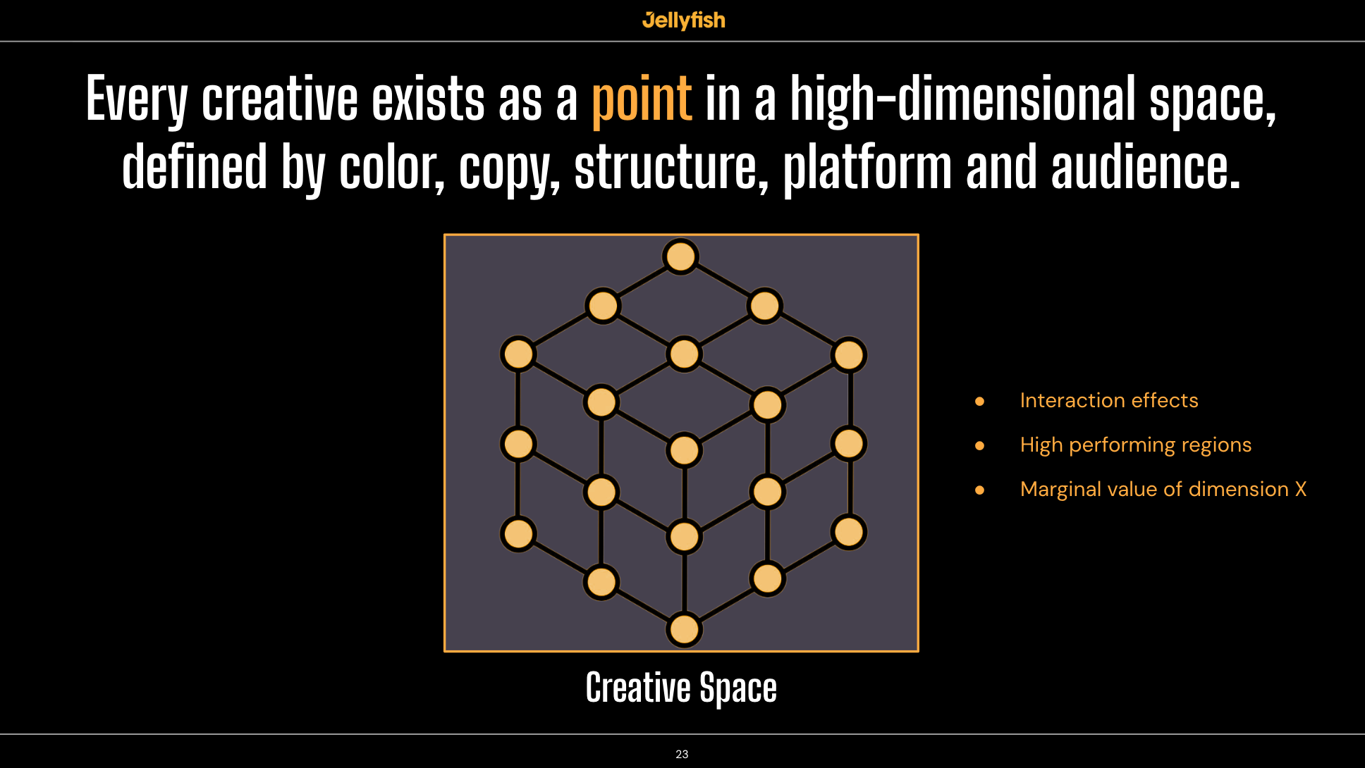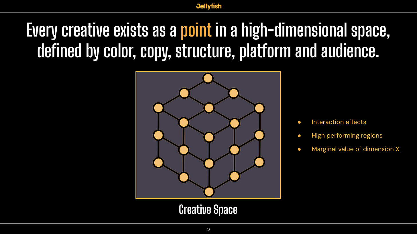 That’s where creative spaces come in. Imagine every possible ad you could run as a point in a coordinate system. Platform, audience, CTA type, headline type, primary color, music type, faces present, product timing. Each ad is defined by its coordinates across n+ dimensions.