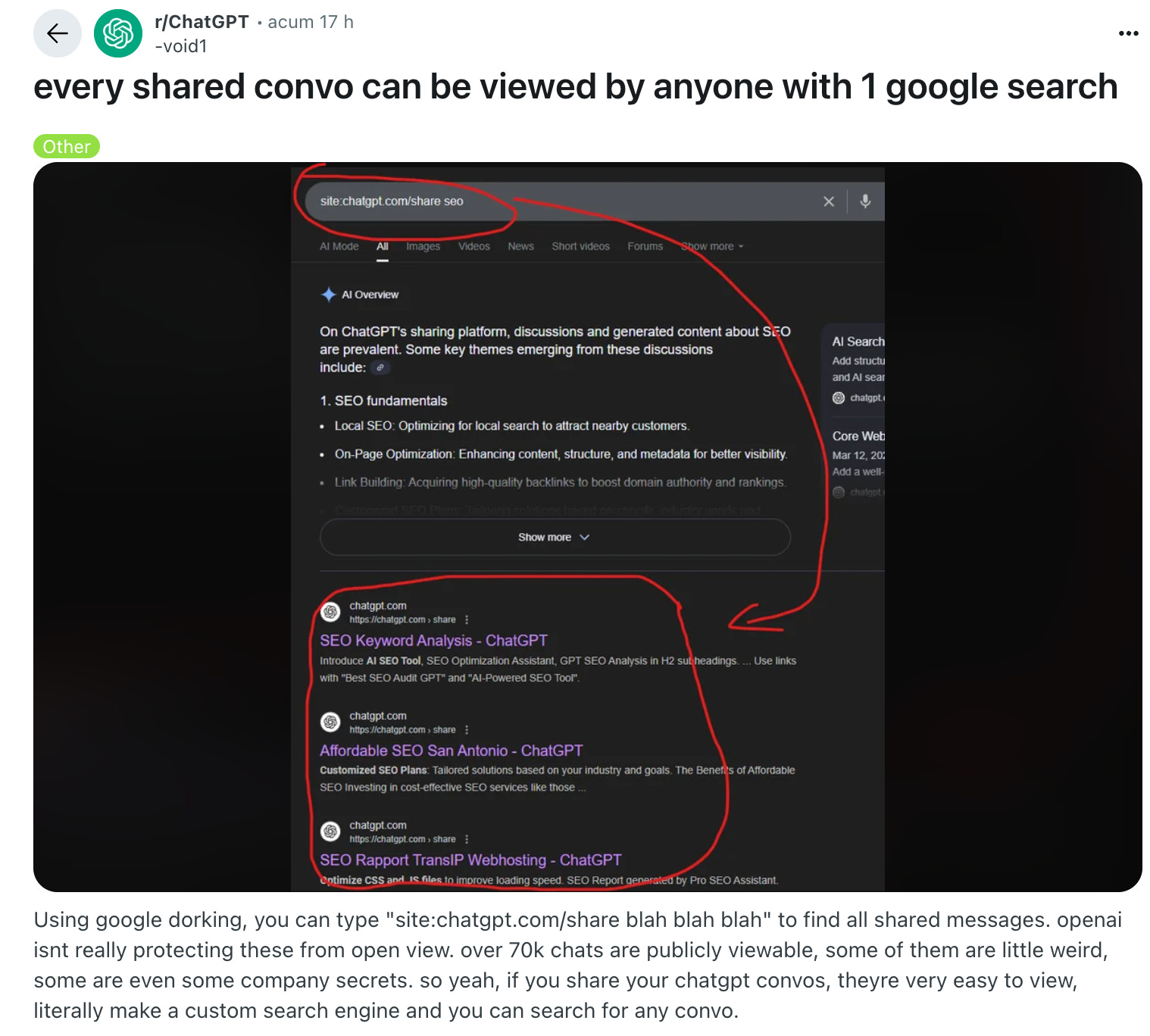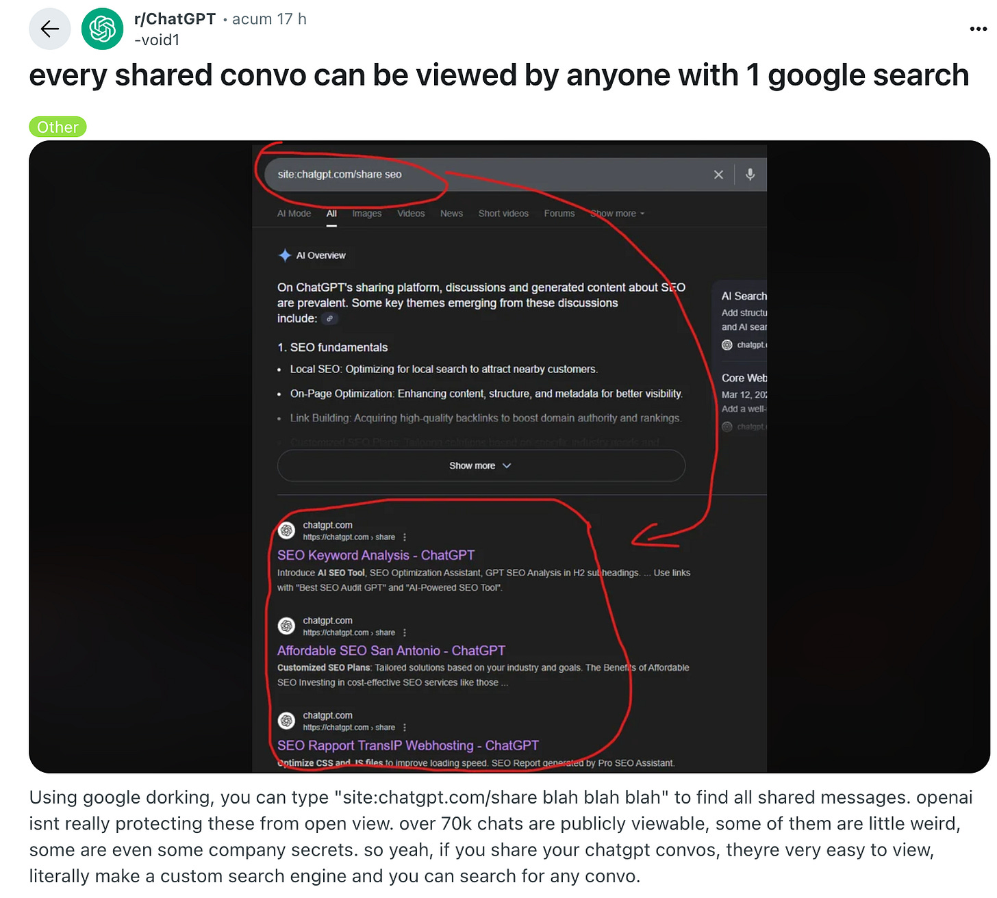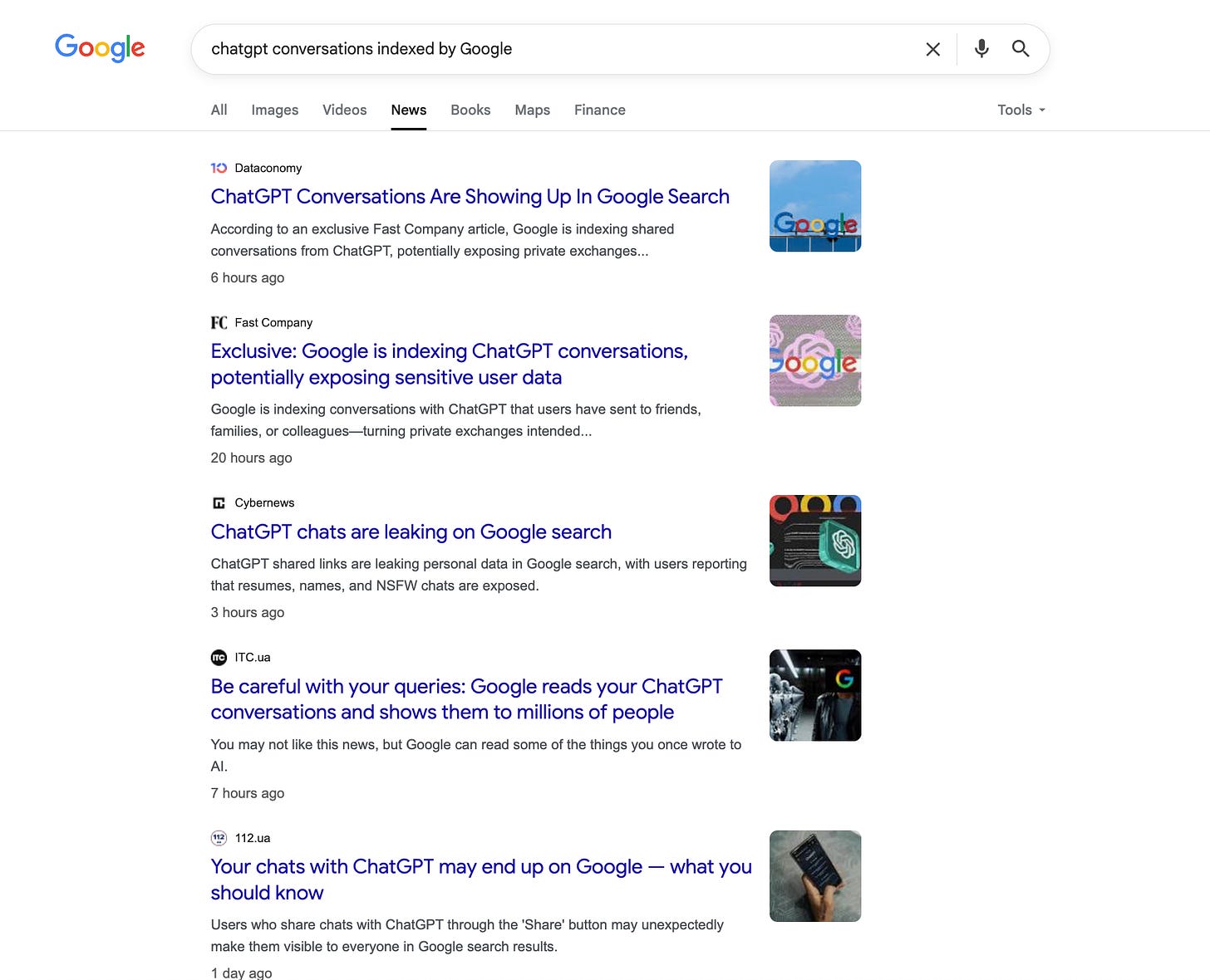 Since yesterday evening, reports, social posts and news articles are flooding in, talking about how shared ChatGPT conversations ended up indexed by Google. Surprise surprise.