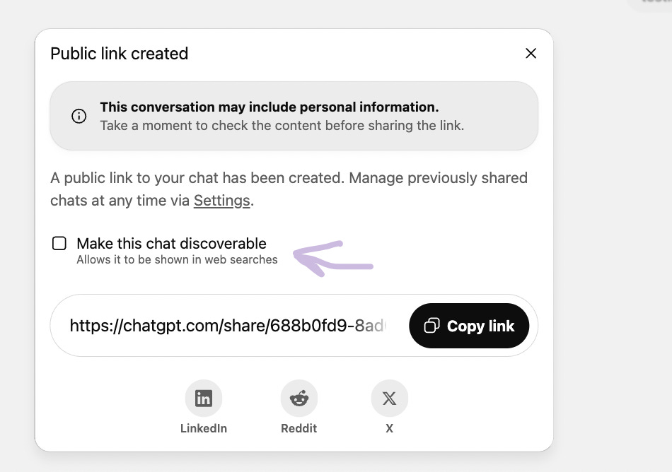 indexdirective, but perhaps the "no indexing by default" implementation isn't as good as it should be, or there are other ways these links become discoverable.And ofc, if a user does toggle the "make conversation discoverable" option, then they're explicitly giving permission for Google to crawl and index it, making it fully public.