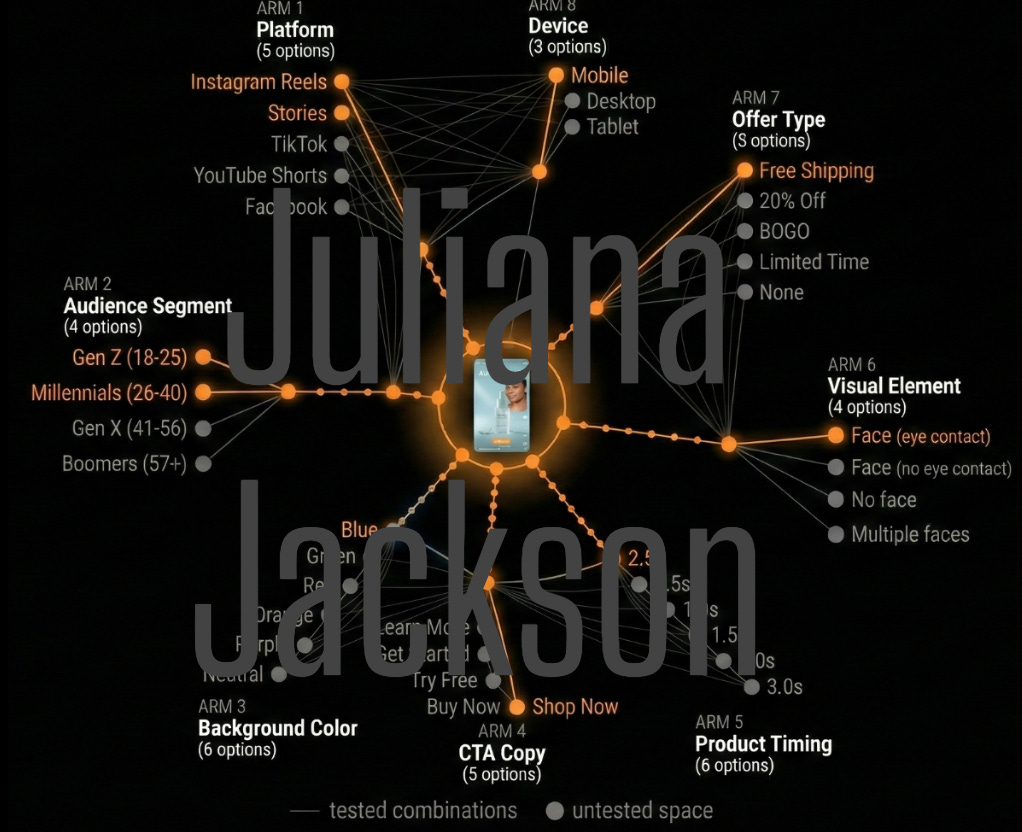 So, if you want to test just a basic matrix: 5 background colors, 5 headlines, 3 CTA types, and two timing variations across three platforms and four audiences, you are looking at maybe 1,800 possible combinations . Add music, face presence, and copy length, and you can quickly exceed 40k variations.
