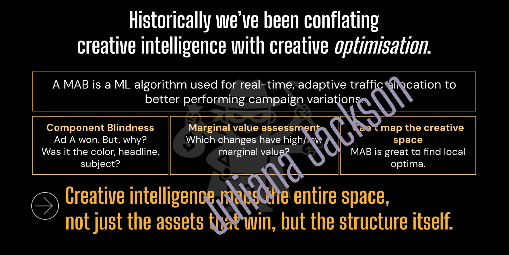 So, why does traditional testing fail here? Sure, you can run some MAB (multi-armed bandits) but they are only good to tell you which ad won, not why, they are only good at finding what is the local optima, they cannot map a creative space.
