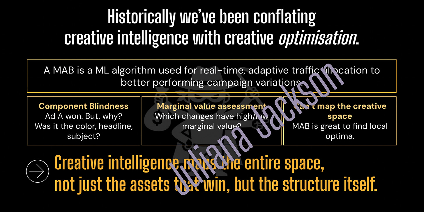 This shifts the thinking from Creative Optimization (finding a local optima for this week’s campaign) to Creative Intelligence (building a global map of what works).
