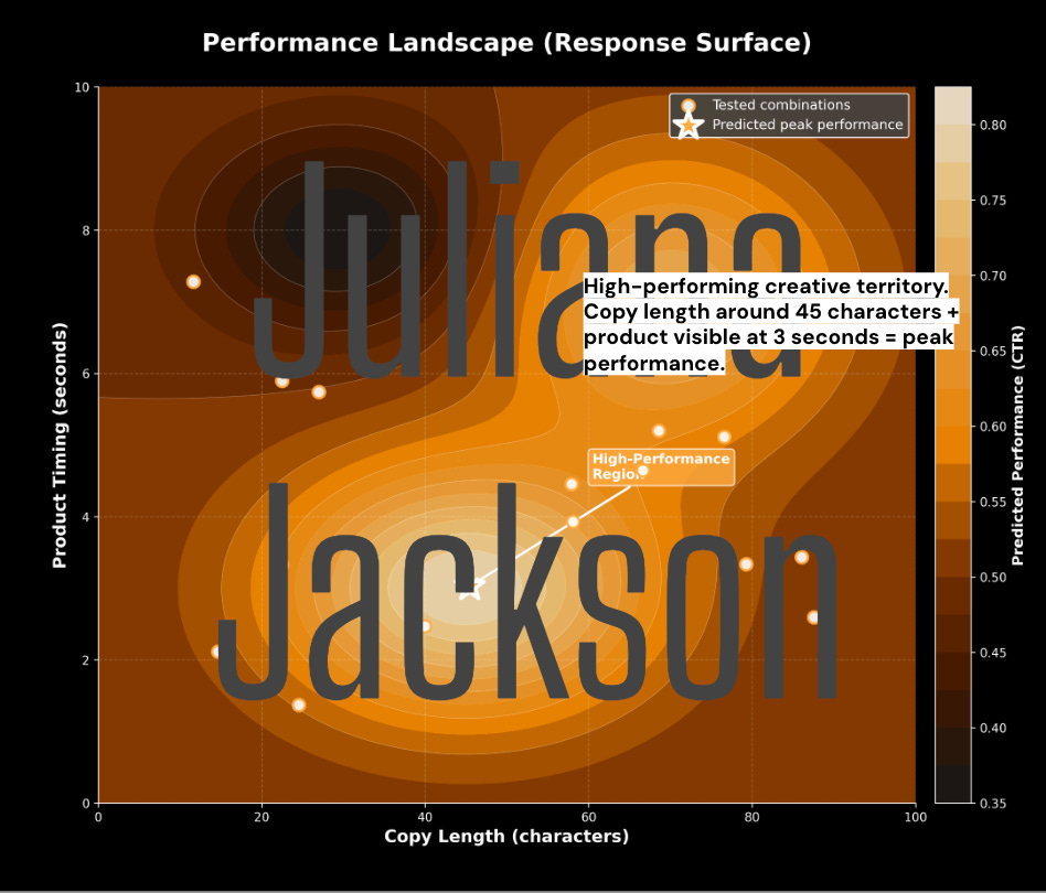 Then, by analyzing the performance of these anchor points, we can map the response surface of the creative space. We can identify the high-performing clusters and accurately predict the performance of the thousands of combinations we never actually launched.