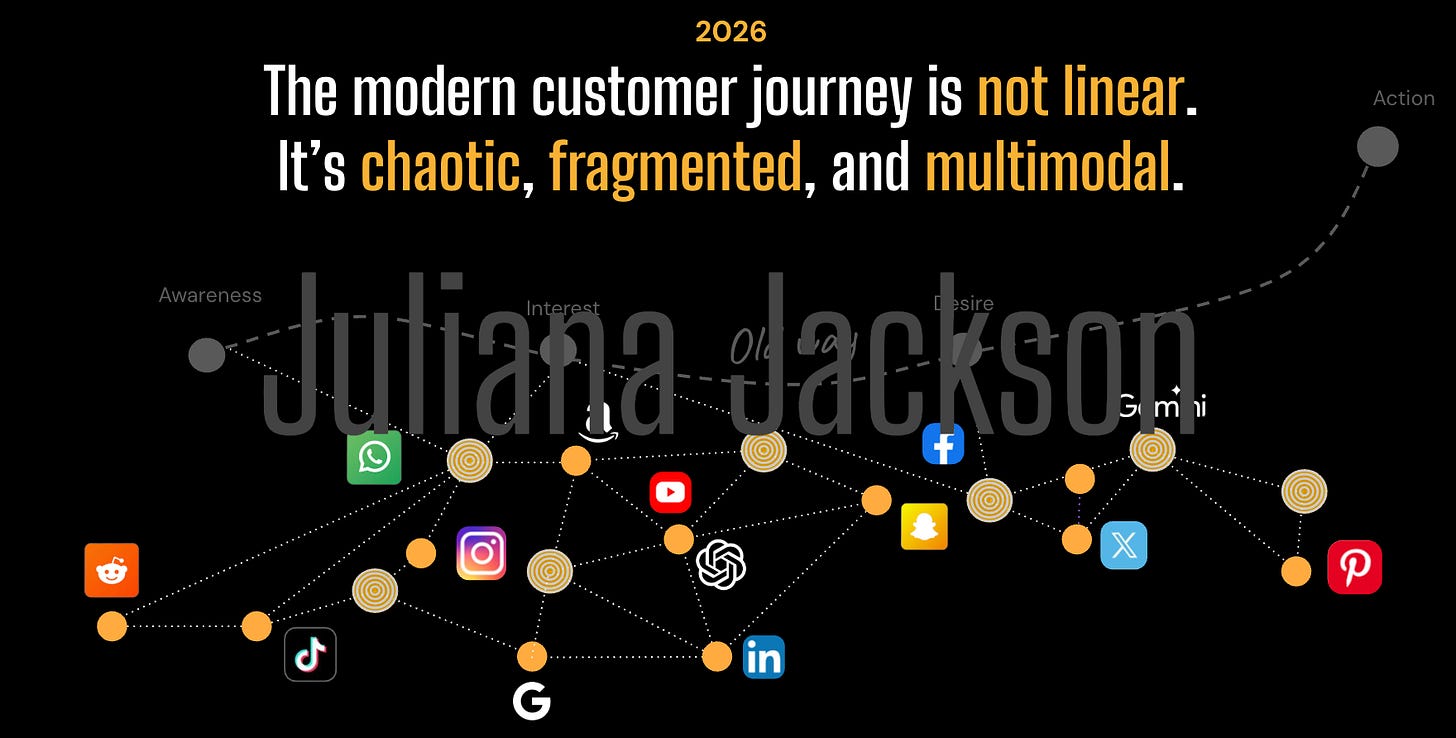 But the modern customer journey is chaotic, fragmented, and multimodal. It loops through TikTok feeds, Reddit threads, and YouTube comparisons in sequences no brand can orchestrate.
