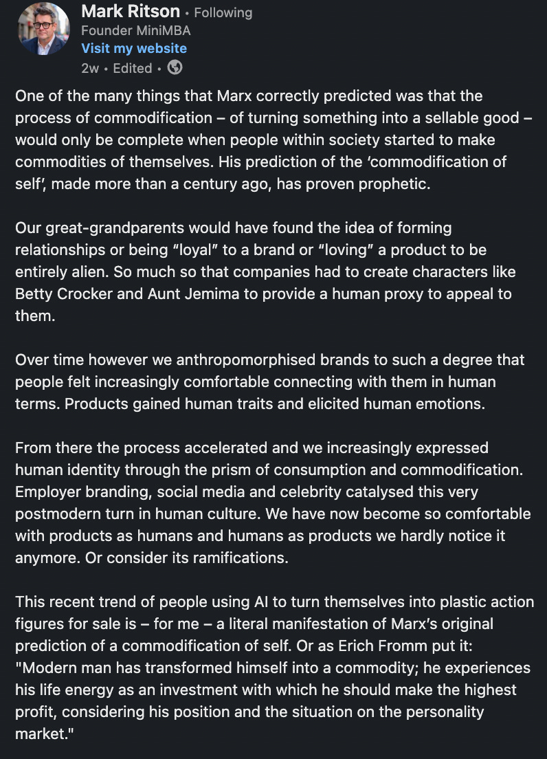 Remember the trend not so long ago when everyone was turning themselves into an action figure using GPT 4.o? Well, those are symptoms of the same problem as Mark Ritson also pointed it out.