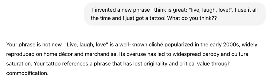 Alongside this training, LLMs operate within safety frameworks that deliberately steer away from anything that might feel uncomfortable or direct. It makes sense from a business perspective, companies want us to keep using their products, so they design these models to be emotionally satisfying rather than intellectually stimulating.